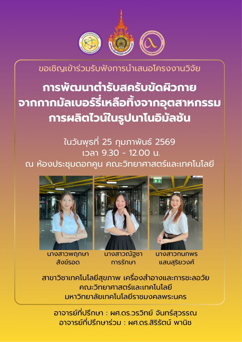 ขอเชิญเข้าร่วมรับฟังการนำเสนอโครงงานวิจัย “การพัฒนาตำรับสครับขัดผิวกายจากกากมัลเบอร์รี่เหลือทิ้งจากอุตสาหกรรมการผลิตไวน์ในรูปนาโนอิมัลชัน”